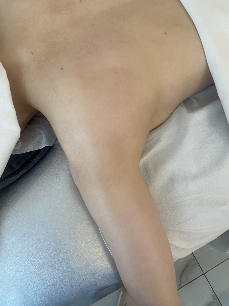 관리 후에 순환이 잘 안되어 뭉쳐진 팔뚝라인과, 라운드숄더로 수축된 근육때문에 한참 화가난 승모근도 차분히 정리가 되어서
